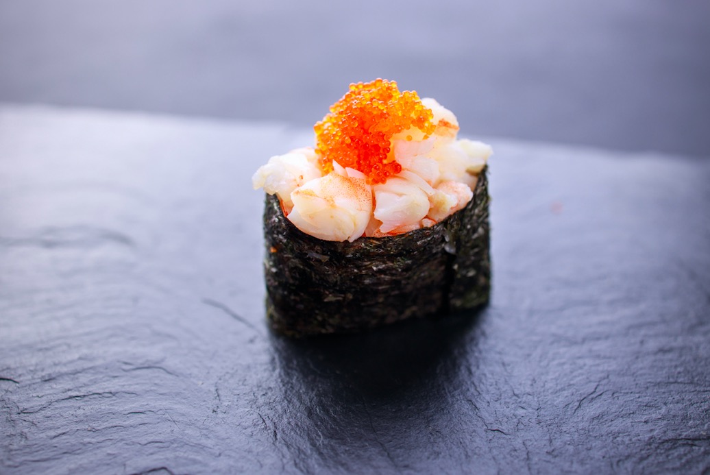 En japonés, "gunkan" significa literamente, "barca". Se trata de un nigiri envuelto con alga nori en forma de barca o cesta. El más famoso de todos lleva huevas anaranjadas de salmón de pez tobiko encima.