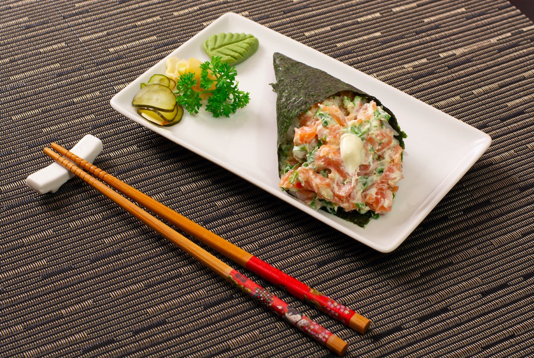 Se trata de un cono de alga nori relleno de arroz con vinagra e ingredientes como mariscos y vegetales. Se puede comer con la mano, sin palillos, y se sirve acompañado de salsa de soja.