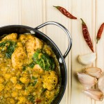 Justo en el último momento, cuando ya esté el pollo casi listo para servir, pon las espinacas y déjalas un minuto o dos cocinando con el pollo antes de añadir el chutney de mango