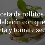 A continuación, estira las láminas una a una y, en un extremo, pon un trozo de queso, unas tiras de tomate y unas hojas de rúcula y enrolla