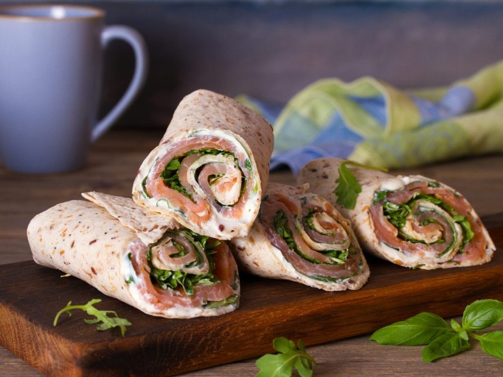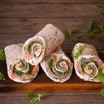Colocamos la tortilla (o wrap) en un plato, añadimos el salmón cortado en tiras, la lechuga y el pepino. Luego agregamos la salsa de yogur y, para terminar, espolvoreamos un poco de eneldo fresco por encima.