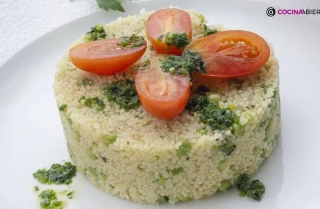 - Pon el cuscús en un bol grande, cúbrelo con la misma cantidad del caldo (caliente) resultante de cocer los guisantes. Tápalo con film de cocina y espera a que absorba todo el caldo (10 minutos aproximadamente). Retira el film y suelta el cuscús con 2 cucharas.