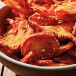 Un aperitivo saludables a base de rodajas finas de tomate que se hornean o se deshidratan hasta que queden crujientes. Es ideal para decorar platos, añadirlos a ensaladas para darles un toque crujiente o simplemente para tomar como una alternativa a los snacks industriales.
