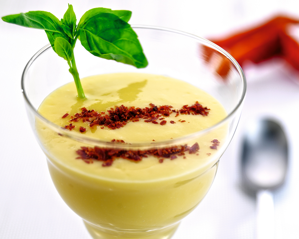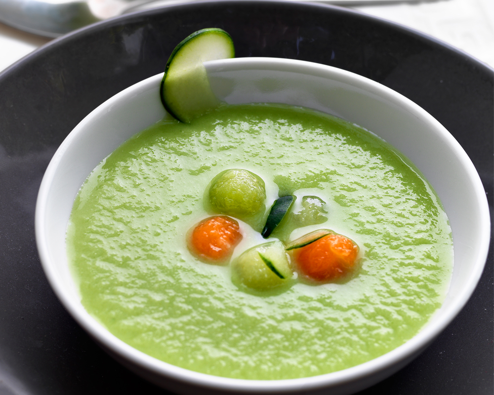 Ingredientes: 3 pepinos, ½ litro de caldo de verduras, unas gotas de salsa Perrins, 3 cucharadas de zumo de limón, 1 melón Galia, 1 melón Cantaloup, sal, pimienta.Pelar los pepinos, dejando parte de la piel. Abrirlos por la mitad, a lo largo, y retirar las semillas. Pasarlos a la túrmix junto con un cuarto de cada melón y el caldo de verduras; triturar hasta que quede una crema homogénea. Agregar el zumo de limón y la salsa Perrins, y rectificar el sazonamiento. Reservar en la nevera para que la sopa se enfríe bien.