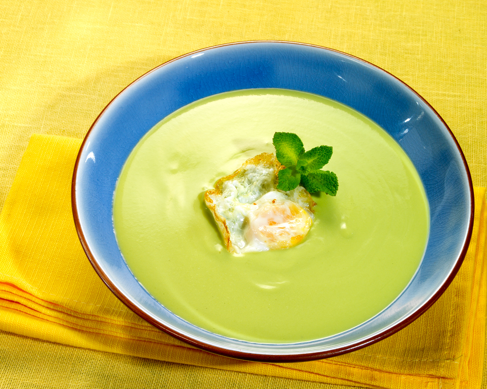 Ingredientes: 3 calabacines, 3 escalonias, 2 dientes de ajo, 1 manojo de menta fresca, 150 g de yogur natural, 250 g de caldo de verduras, 100 ml de aceite de oliva, pimienta, sal. Guarnición opcional: 4 huevitos de codorniz.Lavar los calabacines, secarlos y cortarlos en dados. Lavar las ramas de menta y picar las hojas. Pelar y picar fino las escalonias y los dientes de ajo.