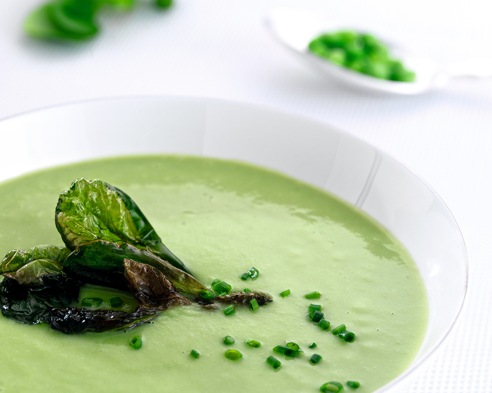 Agregar los guisantes y mojar con 800 ml de agua. Sazonar con pimienta y sal. Tapar la cacerola y cocer a fuego suave durante 15 minutos. Triturar primero en la batidora y pasar después por el pasapurés para lograr una crema muy fina y homogénea.