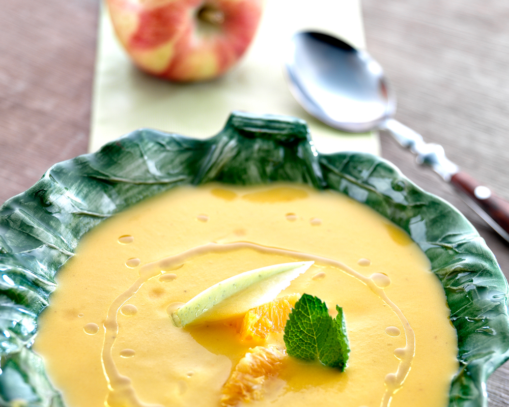 Ingredientes: 1 cebolla mediana, 1 puerro, 3 manzanas Fuji, 2 cucharadas de curry en polvo, 3 zanahorias, la ralladura y el zumo de 1 naranja, el zumo de 1 limón, 1 litro de caldo de ave, 3 cucharadas de aceite de oliva, sal, pimienta, 150 g de yogur, menta fresca picada, unos gajos de naranja.Pelar y picar fino la cebolla y el puerro. Calentar el aceite en una cacerola y rehogarlos hasta que queden lacios. Agregar las zanahorias y las manzanas peladas y troceadas; remover sobre el calor durante un minuto y añadir el curry, la ralladura de naranja y el zumo de limón. Cocer unos segundos removiendo todo.