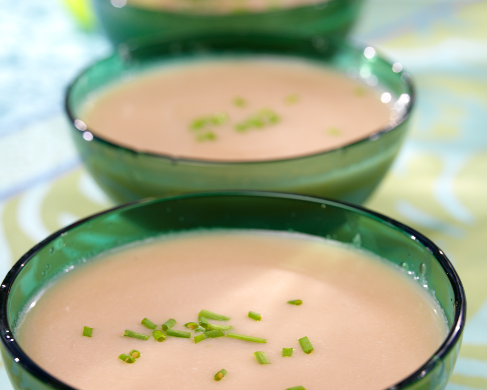 Ingredientes: 3 raíces de hinojo, 2 tallos de apio, 1 apionabo, 1 litro de caldo de verduras, salsa de soja, salsa Perrins, yogur (opcional), cebollino picado, sal, pimienta.Limpiar las verduras, trocearlas y cocerlas en agua con sal durante 20 minutos. Triturarlas y reducirlas a puré con ayuda de una batidora; colarlas para eliminar posibles hebras. Aderezar al gusto con la salsa de soja, la salsa Perrins, sal y pimienta. Mantener en la nevera hasta el momento de llevar a la mesa.