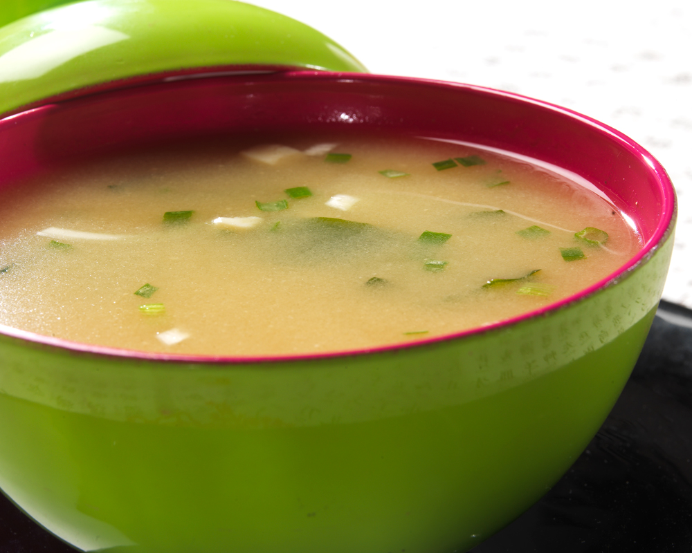 Ingredientes: 150 g de tofu fresco, 1 cebolleta, 1 litro de agua, 80 g de dashi-no-moto, 100 g de pasta de miso, 1 cucharada de mirim, 50 g de alga kombu (estos productos se pueden comprar en tiendas de alimentación oriental).Cortar el tofu en dados. Picar finamente la cebolleta. Mezclar el dashi-no-moto con el agua en una cacerola y llevar a ebullición. Añadir el alga kombu troceada y dejar que dé un hervor. Agregar la pasta de miso y el mirim. Remover bien y bajar a fuego mínimo (a partir de este momento, el caldo no debe hervir).