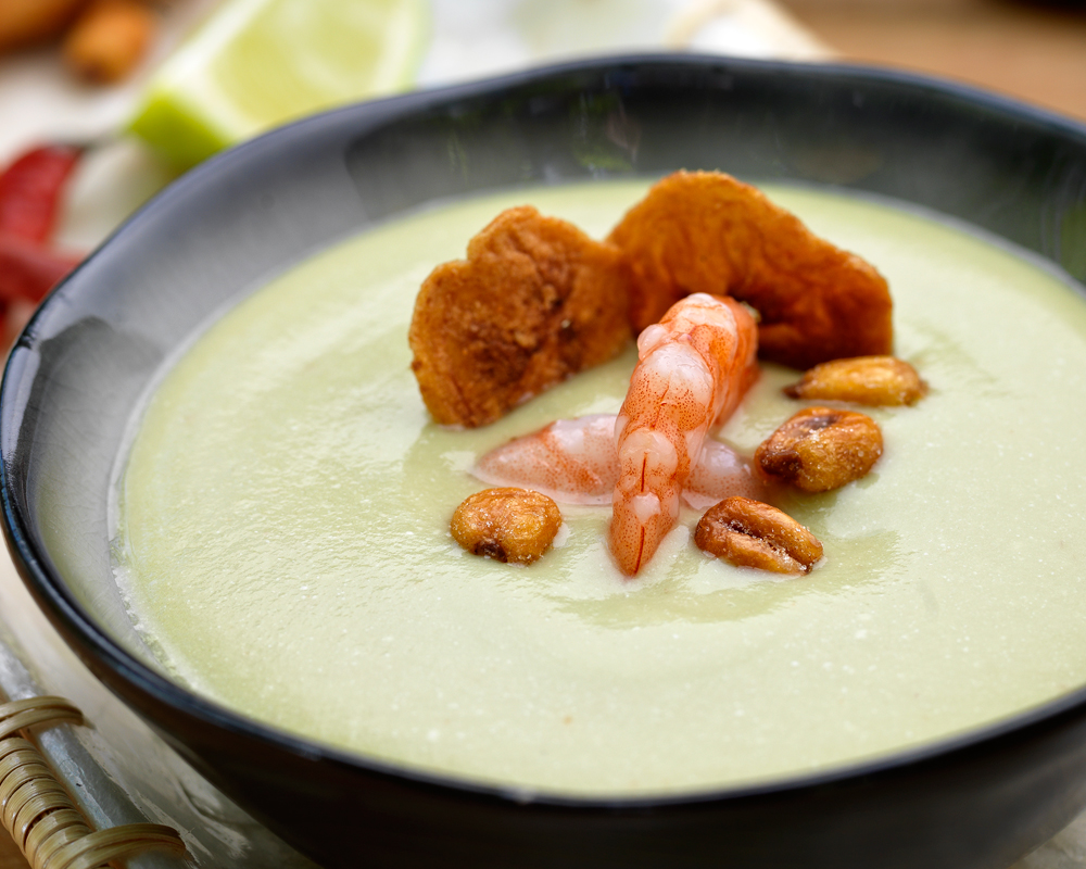 Ingredientes: 2 aguacates, 1 lima, 75 g de yogur, 4 colas de langostino cocidas y peladas, 4 cucharadas de nata líquida ligera, unas gotas de salsa Perrins, 1 cucharada salsa de soja, 1/2 cucharadita de salsa de chile picante, l ¾ litro de caldo de ave, sal, pimienta blanca molida.