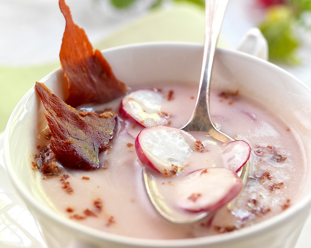 Ingredientes: 2 manojos de rábanos, 1 cebolla, 1 chirivía, 8 lonchas de jamón serrano, 50 ml de aceite de oliva, 1 litro de caldo de verdura desgrasado, pimienta, sal.Cubrir una placa de horno con una hoja de papel de horno. Extender las lonchas de jamón, cubrir con otra hoja y poner encima otra bandeja de horno. Cocer en el horno precalentado a 140 ºC durante 40 minutos. Retirar las lonchas de jamón, quitarles la grasa, trocearlas (reservar algún trozo) y molerlas.