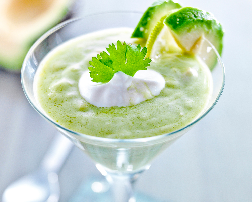Servir en copas individuales, decorando la crema por encima con una cucharadita de yogur, una hojita de cilantro y unos gajos de aguacate y de lima intercalados.