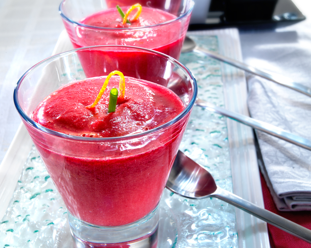 Ingredientes: 700 g de remolacha fresca, 1 pepino, 1 tomate, 1 cebolleta, 150 ml de zumo de naranja, 1 cucharada de vinagre de Jerez, 2 cucharadas de aceite de oliva virgen, sal, pimienta, cebollino.Lavar y secar las remolachas. Retirarles el penacho, dejando 5 cm de tallo (para que no se desangren al cocer y mantengan el color).Poner una cacerola con agua a hervir. Cuando alcance el punto de ebullición, añadir las remolachas y dejar cocer a fuego medio durante 50 minutos. Escurrir, pasar por agua fría y pelarlas. Pelar también el pepino, el tomate y la cebolleta; trocearlos.