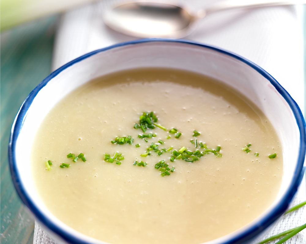 Incorporar los puerros troceados y los dados de apionabo. Saltear durante 2 minutos. Sazonar con el curry, pimienta y sal. Dar una vuelta y mojar con el caldo de verduras. Llevar a ebullición y continuar la cocción a fuego medio de 20 a 25 minutos. Pasar por la batidora y por un colador. Repartir en los platos de servir y espolvorear con el cebollino picado.