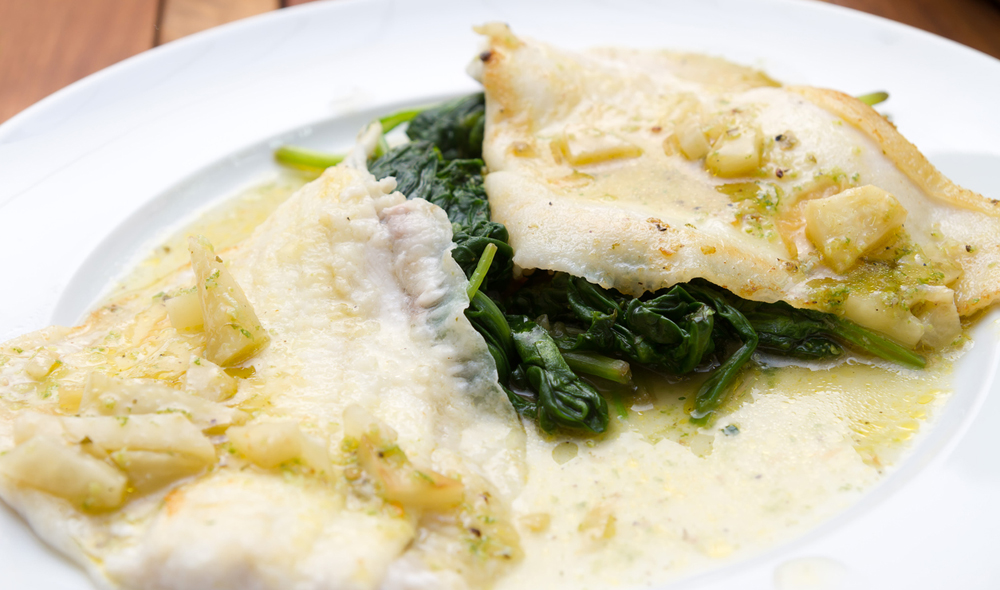 Se asa el lenguado y se acompaña con una salsa hecha con aceite, mantequilla, cebolla, harina, fumet de pescado y vino blanco.
