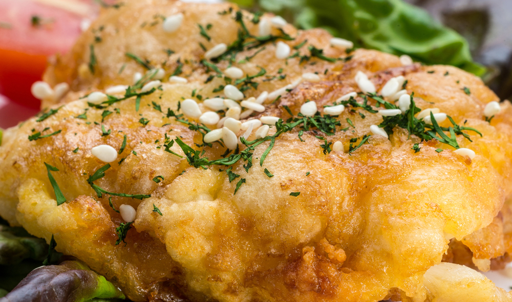 Al lenguado rebozado se le pone una guarnición hecha con ajo, cebolla y hierbas aromáticas.