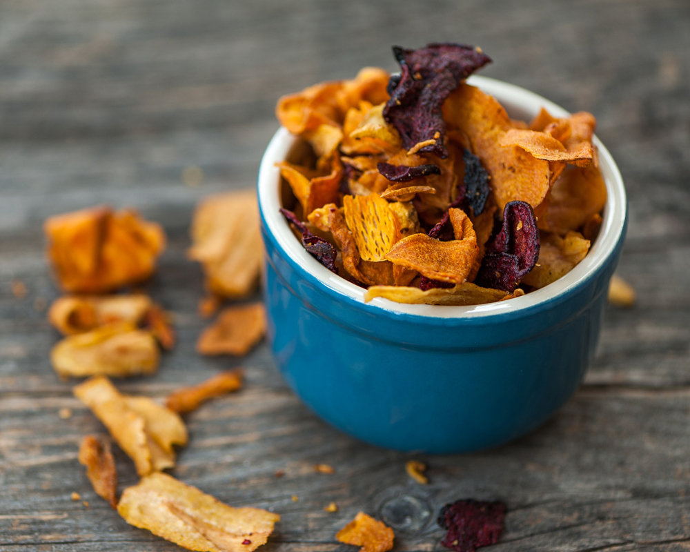 De patata, de zanahoria, de batata, de berenjena... Las chips de verduras, cortadas muy finas, han de estar tostadas, no fritas. 10 unidades aportan 100 calorías y son suficientes para acabar con los picos de hambre.