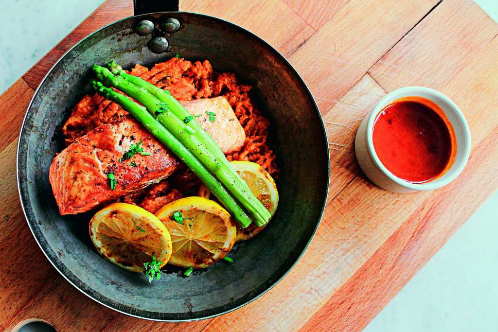 - Sirve el salmón junto con la batata asada y los espárragos.