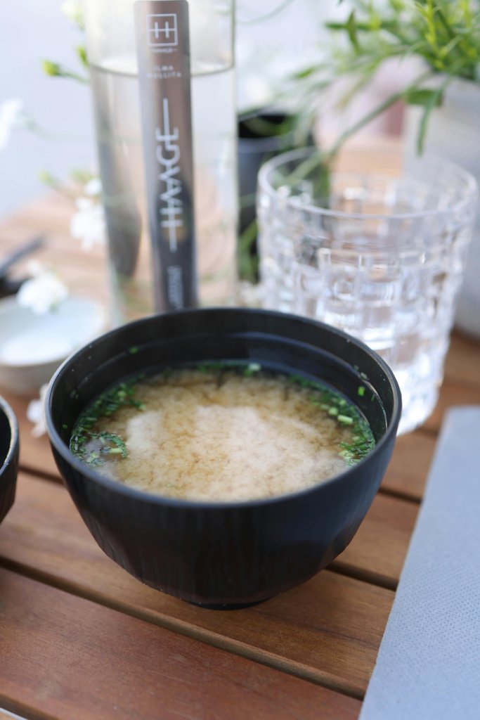 En una olla, lleva a ebullición el agua y baja el fuego. Disuelve la pasta de miso poco a poco, removiendo constantemente para que no queden grumos. Mientras tanto, corta las setas shiitake en láminas y el tofu en cubos pequeños. Añádelos a la olla junto con las algas wakame previamente hidratadas. Cocina a fuego lento durante 5-7 minutos para que los sabores se mezclen. Antes de servir, decora con cebolla tierna picada finamente para aportar frescura y un toque crujiente.