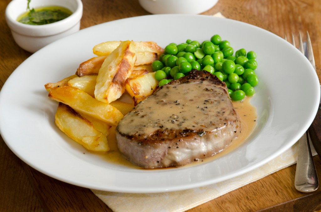 Solomillo de ternera con salsa a la pimienta y patatas fritas