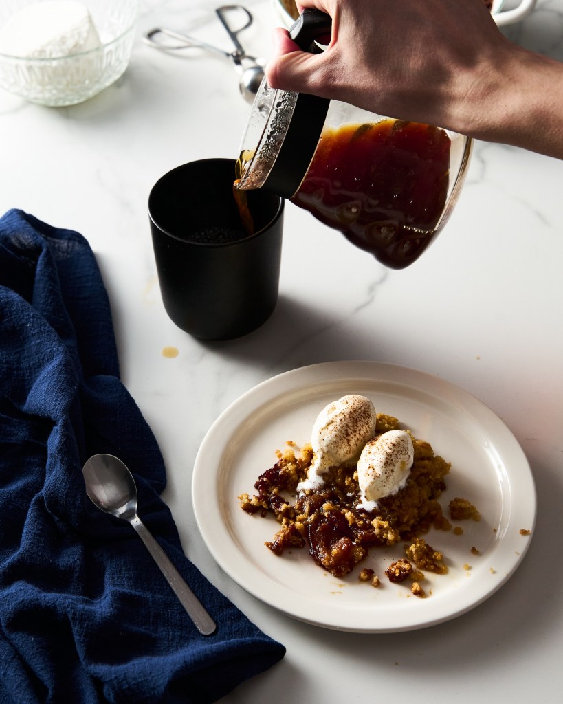 Manzana caramelizada con crumble de nueces y helado de vainilla