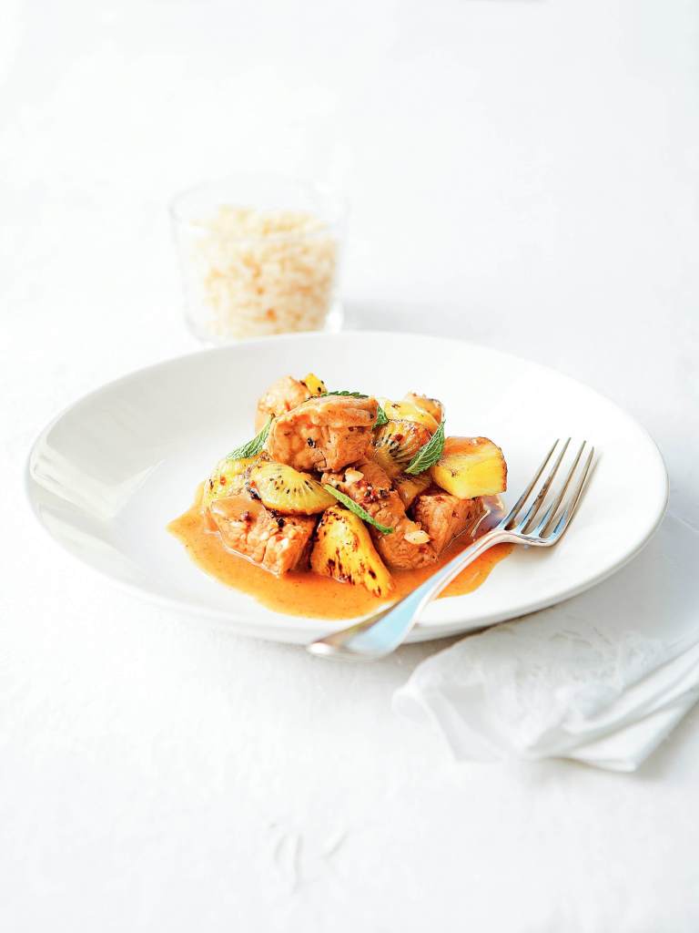 - Agrega el jugo de piña. deja que se cocine durante 10 minutos, hasta que la salsa reduzca. añade el solomillo sellado y cocínalo 2 minutos más. Cocina la piña y el kiwi en una plancha con unas gotas de aceite de oliva, hasta que estén dorados.