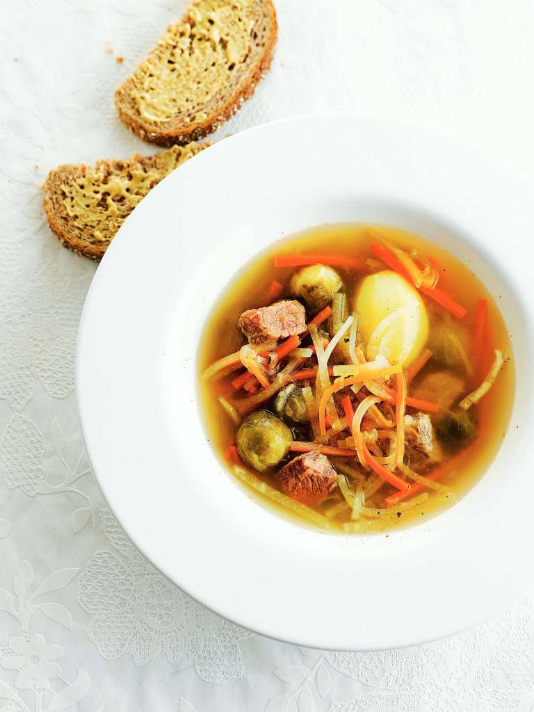 - Lava, pela y raya la zanahoria. Corta la cebolla en juliana. lava bien las coles de Bruselas y las patatas peladas. Cuela el caldo y añádele la carne de cerdo reservada de las costillas y las verduras para el caldo. Deja que se cocine durante 25 minutos. Rectifica de sal y sirve bien caliente