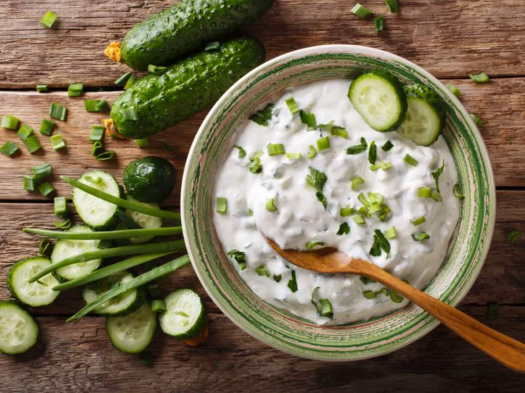 Solo necesitas un yogur natural bajo en grasas, un puñado de eneldo y medio pepino cortado en trozos finos. Lava el pepino y córtalo en trozos muy finos. En un cuenco mézclalo todo. ¡Listo!