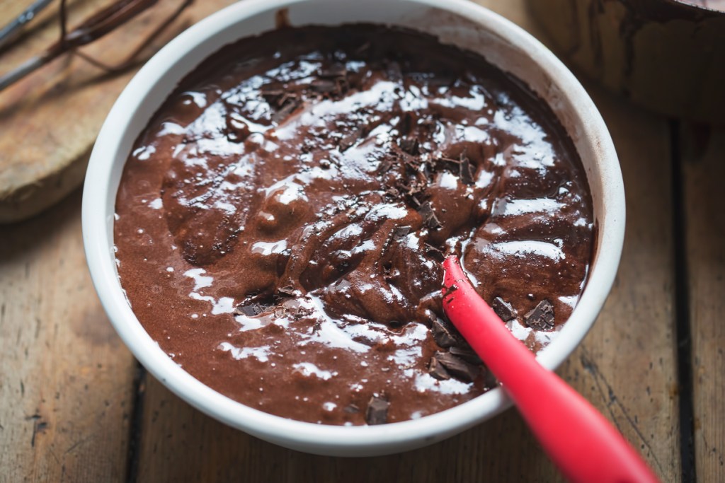Es importante que cuando el chocolate se mezcle con los huevos, no esté caliente, ya que podría “precocer o precuajar” ligeramente los huevos, y no queremos esa reacción en la masa, la queremos más sueltita.