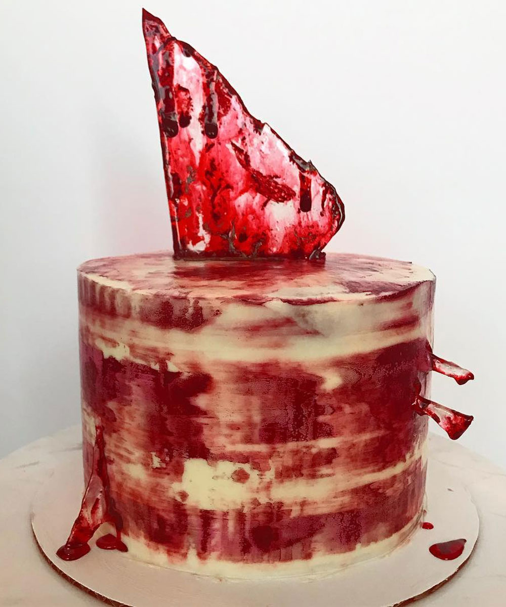 Muchas veces las opciones sencillas son verdaderas joyas de la pastelería. En este caso Kaurscakecouture elige una tarta de varios pisos con frosting entre capa y capa, un poco de sirpoe para emular sangre y un cuchillo comestible en el centro.