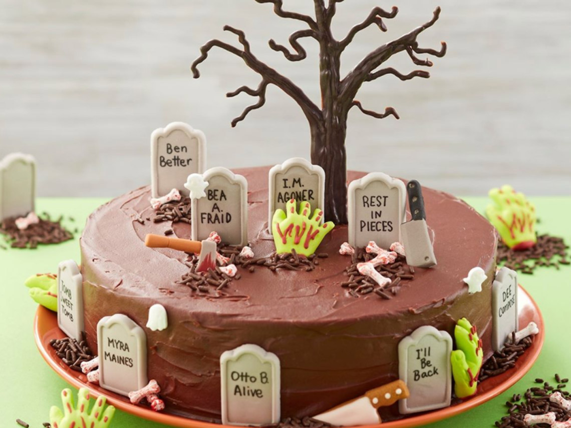 Esta idea de tarta cementerio de @wiltoncakes nos ha encantado. Para hacerla, prepara una tarta de chocolate jugosa y cúbrela con figuritas de glaseado con motivos de Halloween (como, por ejemplo, lápidas) que encontrarás en Internet o en tiendas especializadas en objetos y productos alimenticios de repostería. También puedes adornar con fideos de chocolate.