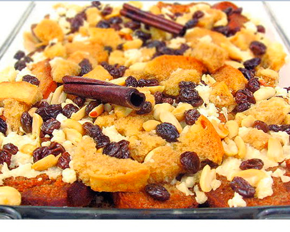 La capirotada es la versión mejicana de nuestras famosas torrijas. Es un pan doradito mojado en miel, canela y anís. Se acompaña con cacahuates y pasas.