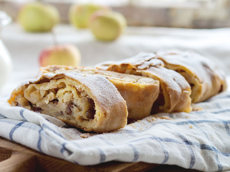 Este postre de nombre impronunciable se conoce como Apfelstrudel y es un pastel de manzana hecho en forma de rollo. La masa que envuelve la compota de manzana es una masa muy fina, elástica y sabrosa. En el interior puedes encontrar la compota de manzana junto con pasas, canela y azúcar. Se acompaña con natillas o helado de vainilla.