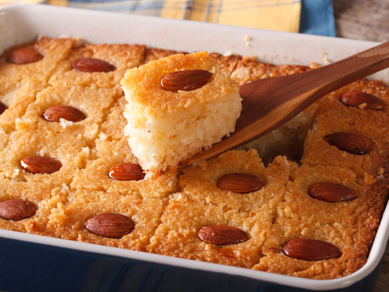 La babousa es una especie de torta dulce hecha con sémola, coco y empapado en almíbar. Es tradicional de Egipto, pero también de otros países del Mediterráneo como Turquía o Grecia. Se sirve cortado en rombos y se le suele añadir una almendra a cada trocito a modo de decoración.