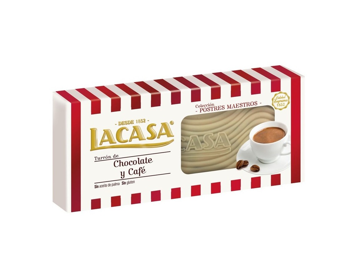 Este turrón es un clásico de Lacasa. Se trata de un praliné de almendras y avellanas elaborado con chocolate y café que es muy reconocible por su cobertura blanca y su relleno oscuro, lo cual le da también un atractivo estético que acompaña a su adictivo sabor.