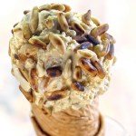 Hacer unas bolas con la cuchara de servir helados, depositarlas en los cucuruchos y espolvorear con piñones previamente tostados en una sartén sin grasa