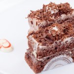 Dejar entibiar las dos espumas y montar la terrina, alternando capas de bizcocho, espuma de chocolate negro y espuma de chocolate blanco hasta llenar el molde por completo