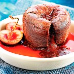 Coloca el almíbar bien frío en la base del plato, desmolda el coulant recién sacado del horno con cuidado y decora con unas cerezas