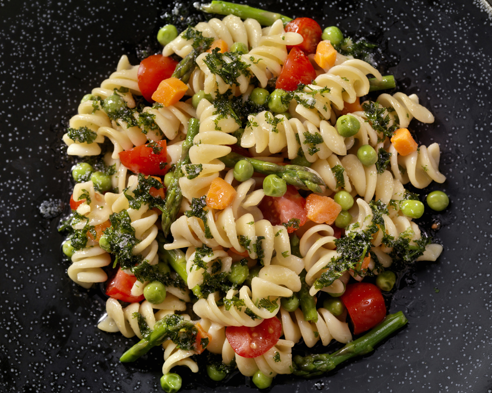 Una ensalada fresca, sabrosa y nutritiva. La pasta combina bien con el tomate, los guisantes, el brócoli o el maíz. Puedes aliñarla con aceite y vinagre o también con un poco de mayonesa o queso.