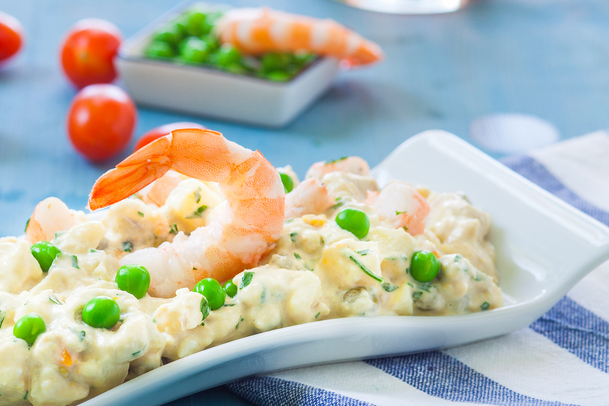 Puedes cocinar esta variante de la ensaladilla rusa con gambas, patatas, guisantes, zanahorias, mayonesa, cebollino, sal y pimienta.