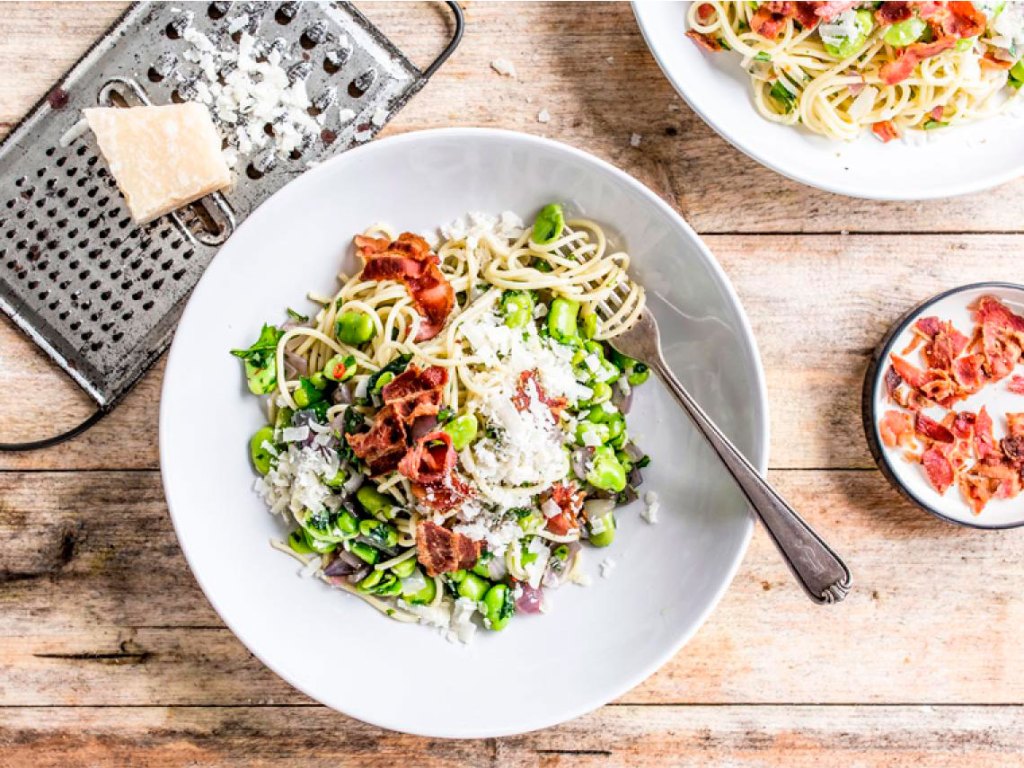 Disfruta de esta versión de los espaguetis más sana. Al no llevar salsa es mucho más ligera que otros platos de pasta más tradicionales. Además las habas y la albahaca dan un plus de nutrición y vitaminas a tu plato.