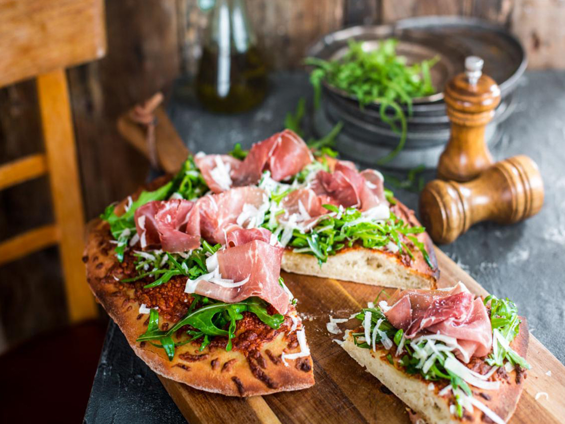 Pizza de jamón, parmesano y rúcula