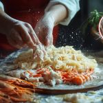 Primero preparar la masa, poner la harina en un bol y hacer un hueco en el centro. Enseguida verter el resto de los ingredientes. Mezclar con unas varillas y luego amasar con los dedos hasta formar una masa elástica. Tapar con un paño y dejar reposar durante 30 minutos.