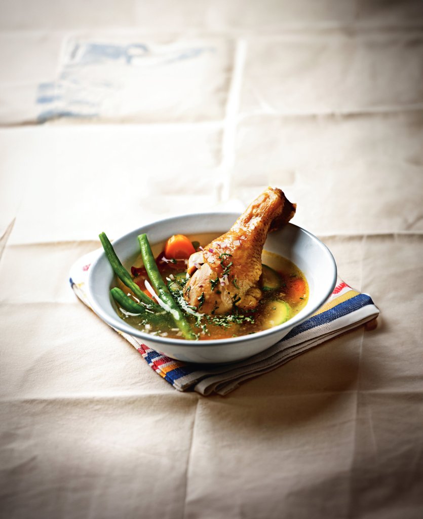 - Limpia el pollo y las verduras. Cuécelo todo en una olla, con 2 litros de agua durante 2 horas a fuego lento. Una vez listo, saca el pollo y desmígalo cuando esté frío. Deja intactos los muslos u otra parte como la pechuga, que luego puedes aprovechar para acompañar la sopa. Cuela el caldo resultante de la cocción.