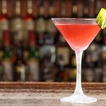 coctel cosmopolitan en copa de martini sobre barra de bar
