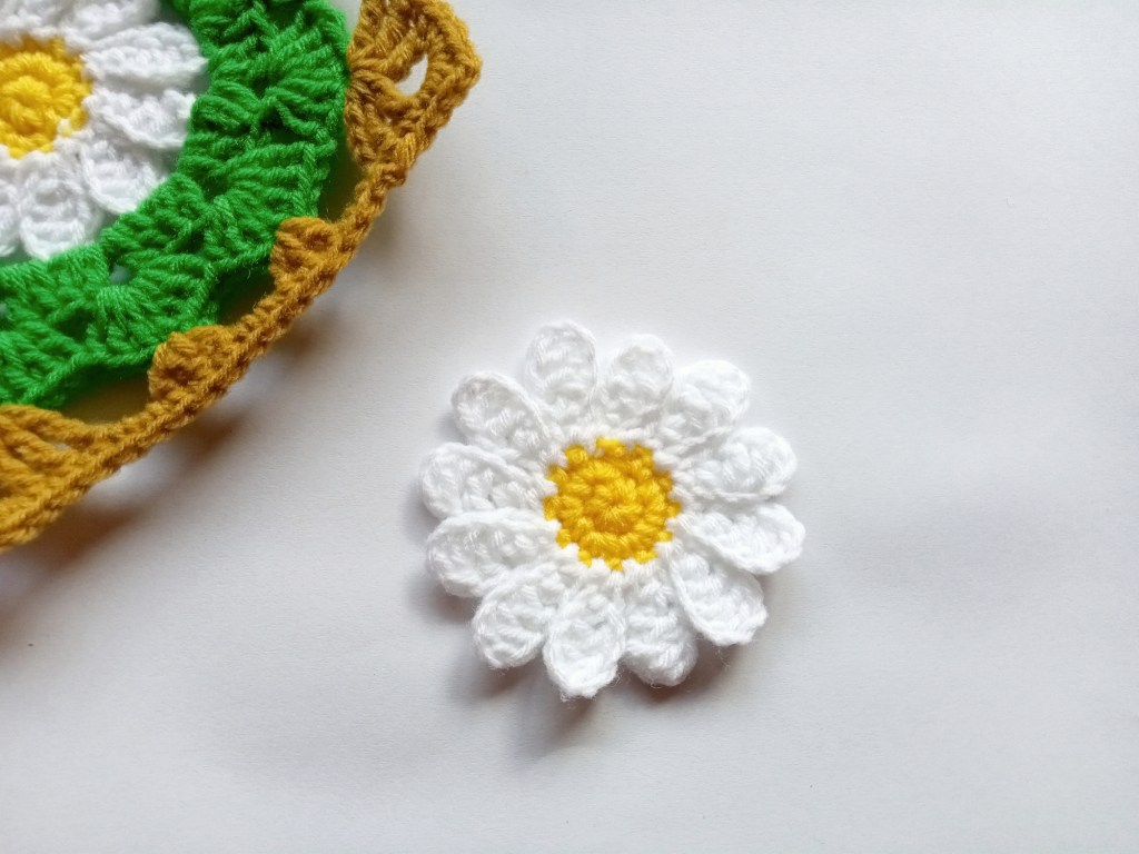Ya sé que hemos puesto el ejemplo de las margaritas como el aplique floral a crochet más típico, pero eso no quita para que lo sigamos teniendo en cuenta como una opción más. Aquí tienes un ejemplo de cómo tejerlas en tamaño pequeño, por si quieres hacer una prenda que lleve varias.