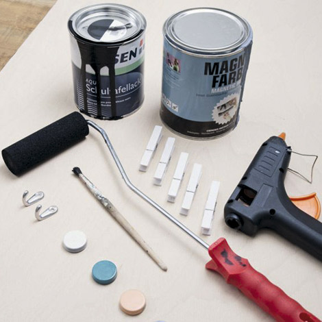 Podemos hacer una pintura de pizarra casera (aunque no magnética) mezclando 90 g de yeso (o tiza molida), 25 ml de pintura acrílica (gris o negra) y 10 ml de agua tibia. Mezclar bien para que no haga grumos.