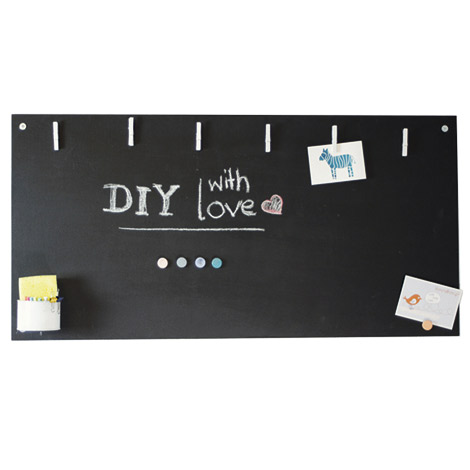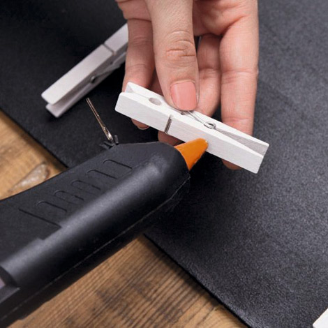 Con pegamento caliente pegamos en la parte de arriba de la pizarra las pinzas de madera (que habremos pintado de blanco previamente). Las pinzas nos servirán para prender en ellas tarjetas, fotos, notas o recordatorios.