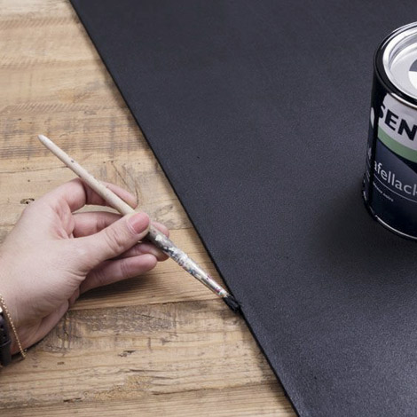 Cuando el primer color se haya secado, damos una capa de pintura de pizarra. En este caso es negra, pero puede ser de colores. Con un pincel pintamos los bordes.