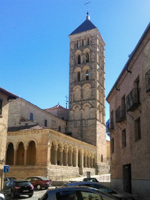 El espléndido templo, un compendio del románico castellano, está definido por un triple atrio de columnas y tres ábsides, una torre mudéjar que ocupa el espacio del cimborrio.